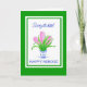 Una bonita tarjeta de felicitación atrasada del Año Nuevo Persa, con '¡Lo siento, llega tarde!' y una maceta azul y blanca de jacintos rosas en un borde verde y Feliz Norooz en azul, de una pintura en acuarela de Judy Adamson. También está disponible una versión frontal personalizada de este diseño y puede personalizar el mensaje interior de esta tarjeta si lo desea.
