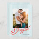This fun and festive holiday photo card features a customizable color stripe background, one vertical photo, retro script greeting, and simple typography. The back of the card has the same pattern (you can also add another photo and/or additional text to the back). **All colors of this design are customizable.**