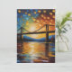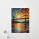 Una vibrante puesta de sol proyecta un cálido resplandor sobre un río sereno, cruzado por un puente de silueta con árboles que bordean ambas orillas. El cielo está salpicado de manchas coloridas y de mosaicos que crean un ambiente animado y dinámico.