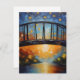 Una vibrante puesta de sol proyecta un cálido resplandor sobre un río sereno, cruzado por un puente de silueta con árboles que bordean ambas orillas. El cielo está salpicado de manchas coloridas y de mosaicos que crean un ambiente animado y dinámico.