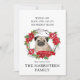 Diseño de acuarela a mano de una encantadora cabeza de Pug de la flor enmarcada con una hermosa corona que muestra ramas naturales y hermosas flores de Poinsettia. Esta tarjeta hace sonreír a cada amante de los perros y muestra que el perro es parte de una familia amorosa. Intercambie la frase de opinión y la personalice con su apellido o sólo el nombre del perro.