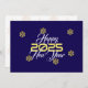 Greeting wish card Happy New Year written in English in mauve and yellow font with golden snowflakes on a purple background - editable text and background