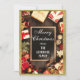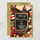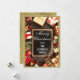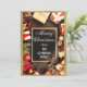 Festiva tarjeta navideña Feliz Navidad con un brillante purpurina dorado que brilla la frontera y regalos rojos con arcos que rodean un pizarrón negro en madera marrón rústica. Esta tarjeta contiene las palabras "Feliz Navidad" en un elegante guión con letras a mano, y tu apellido familiar en blanco.