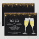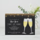 Dos vasos de champán en brindis para celebrar esta llamativa invitación a la fiesta de Año Nuevo. El confetti de oro falso se ducha contra un fondo negro rico en la parte superior e inferior de esta invitación. El fondo se repite al revés junto con el texto que desee agregar. Además de una celebración de Año Nuevo, esta invitación puede ser personalizada para una fiesta de vacaciones en la oficina, cumpleaños, boda de Nochevieja o fiesta de cócteles de vacaciones. Disponible con productos a juego.