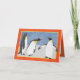 Linograbado original de pingüinos cotilleando por Janice Lawrence.. Parte de una colección de tarjetas de Año Nuevo diseñadas para ayudarnos a recuperarnos de 2020.
