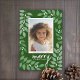 Una moderna tarjeta de fotos navideña con hojas botánicas y bayas - verde, blanco y verde azulado. El diseño moderno incluye ramas de eucalipto y bayas y sans serif para la parte principal del texto. El saludo está escrito en un estilo rústico moderno. En la parte posterior se muestra un patrón de eucalipto en verde y blanco.