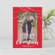 Comparte saludos de Navidad con todos tus amigos y familia con esta divertida tarjeta caprichosa gris y blanca. Este diseño presenta su foto en un fondo rojo y verde con divertidas luces de cuerda y tipografía personalizado. ¡Y no dejemos de lado los puntos rojos de polka en la parte de atrás! Foto de Gracie Mae Photography https://maeganbartell.wixsite.com/graciemaephotography
