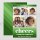 FRENTE - 5 Collages de fotos con rayas retro verde oliva brillante. La palabra "vítores" está en una fuente divertida que se coordina con un fondo no tradicional. Las 5 fotos funcionan mejor si se recortan las fotos en cuadrado antes de subirlas. Añade tu saludo y firma familiar a este diseño ecléctico y colorido. BACK - Patrón de rayas retro en una mezcla de verde y oliva. Si necesita mover algo, haga clic en el botón personalizar para realizar cambios.