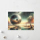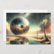 Esta esfera metalica acristalada y surrealista refleja un paisaje apocalíptico y desértico barón, con árboles muertos, fuego y humo.