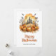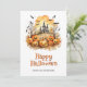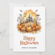 Tarjeta de Halloween con graciosos jack o'lanterns, murciélagos, mansión embrujada y un fantasma esqueleto. Personalice fácilmente esta tarjeta acuarela de Halloween con su nombre y texto familiar.