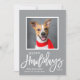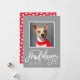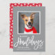Muestra a tu peludo miembro de la familia con estas modernas tarjetas de Navidades "Happy Howlidays" que incluyen tu nuevo cachorro perro, la redacción "Peace, Love & Treatment" (Paz, Amor y Tratamientos) y los acentos de diseño de huellas de pata. Combinación de colores rojo, gris y blanco.