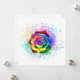 Rosa grande y floreciente con pétalos de arco iris sobre fondo blanco, pintado con salpicaduras de pintura colorida y brillante. 3.ª