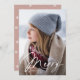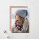 Tarjeta fotográfica de vacaciones moderna con "Merry" mostrado en un guión escrito a mano en blanco sobre tu foto vertical. Personalice la parte delantera de la tarjeta de fotos de Navidad con el nombre de su familia y el año. La tarjeta se revierte a un rosa polvoriento y a un patrón de copos de nieve blanco.