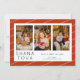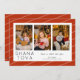 La tarjeta de Rosh Hashaná Shana Tova 3 Fotocolage es un diseño elegante con un collage de tres fotos en la parte delantera, una línea para sus deseos y una plantilla para el nombre de su familia y nombres. La parte trasera es un rojo festivo con rayas diagonales