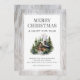 Rustic watercolor holiday card featuring a log cabin inside a rustic wood frame adorned with falling snow. Easily personalize this cute holiday card with your family name and text.