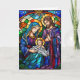 Diseño de vidrio emplomado de la sagrada familia. María, José y el niño Jesús. En el interior de la tarjeta en rojo está el versículo Mateo 1:23, "He aquí, la virgen concebirá y dará a luz un Hijo, y llamarán su nombre Emanuel"