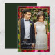 Hermosa acuarela roja floral y verde con elegante alegria y caligrafía casada en el saludo de vacaciones de Navidades verdes del bosque oscuro, presenta la foto de la nueva pareja y su nombre en un simple texto blanco.