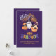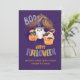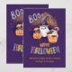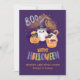 Esta tarjeta de Halloween adorable y personalizable presenta un fantasma sonriente que lleva un sombrero de bruja morado, una calabaza con un gato y una taza de pastel festiva coronada con murciélagos, todo sobre un fondo místico morado. La letra colorida que dice “Feliz Halloween” y el mensaje cálido “Saludos espeluznantes de Bridget y George” la hacen ideal para enviar deseos alegres de Halloween a amigos, niños y familiares.