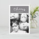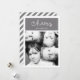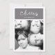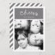 Tarjetas de Navidad modernas con foto con la palabra, con tipografía blanca tierno, "Cheers", de fondo gris, y un sencillo patrón rayado gris y blanco, con rayas diagonales.