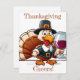 Este es un pavo de Acción de Gracias levantando un vaso de vino en un brindis. Una tarjeta divertida y linda para usar como invitación a su hogar o para enviar como un "pensando en ti en Acción de Gracias". El pavo está vestido de peregrino con el vaso levantado en alto.