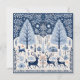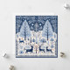 Una hermosa ilustración de una escena boscosa con ciervos, árboles y animales en una paleta de colores azules, obra de arte inspirada en Escandinavia, patrones de follaje detallados, motivos nórdicos tradicionales y una rústica casa de madera visible en el fondo. Un borde decorativo rodea todos los elementos. El diseño incluye elementos como cuernos de ciervo, flores silvestres, hojas, luciérnagas, estrellas y huellas de animales. ¡Un hermoso diseño para todas tus festividades navideñas!
