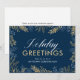 Esta tarjeta de Navidad corporativa es la forma perfecta para que cualquier empresa exprese gratitud a sus clientes. La parte delantera muestra follaje navideño dorado sobre un fondo azul profundo, con texto elegante que dice "Saludos Navideños". Puedes personalizar la parte trasera con tu propio mensaje o elegir el mensaje de agradecimiento sencillo proporcionado.