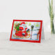 Tarjeta de navidades con la imagen de Santa Claus y su trineo estacionado mientras usaba su celular y mensajes de texto. Esta tarjeta envía un mensaje de los peligros de enviar mensajes de texto mientras se conduce.
