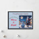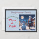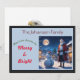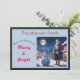 Una tarjeta de Navidad personalizada con Santa Claus y un muñeco de nieve parados en el pueblo en Nochebuena con luna llena.