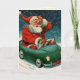 Conducción pasada de moda de Papá Noel qué mira para ser un coche eléctrico a través de una nevada que ciega. Las mejillas rojas rechonchas, las cejas blancas espesas y un centelleo en su ojo hacen esto una tarjeta de Navidad perfectamente nostálgica con deseos calientes su familia y amigos.