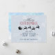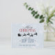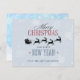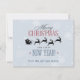 Una tarjeta de bienvenida para navidades festivos - de estilo plano. Un sutil fondo gris con copos de nieve. Fancy trendy lettering, que dice: Feliz Navidad y Feliz Año Nuevo. Con una silueta negra de santa montando en su trineo siendo jalada por su reno volando por el cielo. El dorso de la tarjeta tiene un fondo de copo de nieve azul hielo con tu mensaje personalizado.