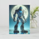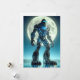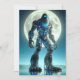 Sasquatch se levanta bajo una luna llena rodeada de montañas, revelando una exposición de titanio de circuitos electrónicos y luces LED...