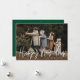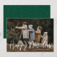 Tarjetas fotográficas de vacaciones modernas con tu foto horizontal con "Feliz Año Nuevo" mostrada en un guión escrito a mano en blanco. Personaliza la tarjeta de Año Nuevo con tu apellido y el año. La única tarjeta de vacaciones fotográfica se invierte para mostrar un fondo verde con puntos blancos sutiles.