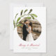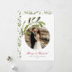 Una hermosa tarjeta de vacaciones celebrando tu primera Navidad como pareja casada. El diseño incluía tu foto favorita en una apertura de círculo adornada con una rama de acuarela de mistletoe. Personalice el titular del tipo de letra del guión cursivo rojo y cierre la sesión en verde oscuro. Al revés hay un patrón de ramas de mistletoe de acuarela.