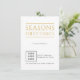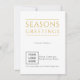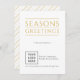 Envíe esta moderna tarjeta de vacaciones de negocios a sus clientes y socios. Presentando el texto Seasons Greetings in gold. El resto del texto está en negro. La tarjeta tiene un fondo blanco. Puede actualizar el texto: ~ de tus amigos en ~. Actualice un texto de marcador de posición con su nombre de empresa o de negocio y otro con su eslogan de empresa o línea de etiqueta, y/o información de contacto de la empresa, como número de teléfono, dirección de correo electrónico y/o medios sociales. Sube tu propio logotipo.