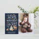 Esta hermosa tarjeta fotográfica de vacaciones muestra animales de bosque pintados (un ave, ciervo, ardilla y conejo), un árbol de Navidad, vegetación, bayas y estrellas sobre un fondo blanco. La tipografía elegante dice: "¡Es la época más maravillosa del año!" La parte posterior contiene un patrón de hojas, bayas, brotes y estrellas que se corresponde.