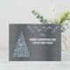 Greeting wish card Merry chrsitmas and Joyful New Year written in English in white font with light blue christmas tree & balls on a silver background - editable text and background