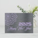 Greeting wish card Happy New Year written in English in mauve font with mandala on a silver background - editable text and background