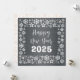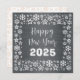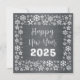 Square wish card Happy New Year written in English in white font with a lot of golden stars on a silver background - editable text and background