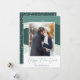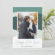 Una moderna y elegante tarjeta de vacaciones en colores suaves con tu foto favorita vertical o orientada a retratos sobre un fondo de color de nevada en tonos de abeto y verde cazador. "Feliz Año Nuevo" aparece debajo de un hermoso guión escrito a mano, con tu apellido debajo.