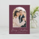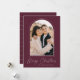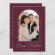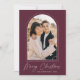 Tarjeta de Navidad moderna con tu foto vertical enmarcada por un arco de puntos con un fondo de color vino (o color de tu elección). "Feliz Navidad" se muestra en letras blancas de moda. Personalice la parte delantera de la tarjeta agregando el nombre de su familia y el año. La tarjeta se invierte para mostrar un patrón de línea punteada en blanco.
