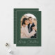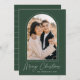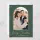 Tarjeta de Navidades modernos con tu foto vertical enmarcada por un arco de puntos con un fondo verde (o color de tu elección). "Feliz Navidad" se muestra en letras blancas de moda. Personalice la parte delantera de la tarjeta agregando el nombre de su familia y el año. La tarjeta se invierte para mostrar un patrón de línea punteada en blanco.