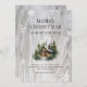 acuarela Tarjeta navideña con una cabaña de troncos en el bosque contra un fondo rústico de madera adornado con copos de nieve. Personalice fácilmente esta tarjeta de vacaciones con su nombre y texto de familia.