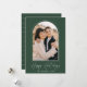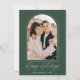 Tarjeta de vacaciones moderna con tu foto vertical enmarcada por un arco de puntos con fondo verde. "Happy Holidays" se muestra en la escritura blanca a la moda. Personalice la parte delantera de la tarjeta agregando el nombre de su familia y el año. La tarjeta se invierte para mostrar un patrón de línea punteada en blanco.