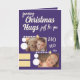 Enviando abrazos de Navidades sólo por tu tarjeta de felicitación. Añade tus dos fotos y tu mensaje. Diseñado en colores crema, violeta y blanco, con estrellas y bolas de nieve.