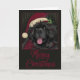Hermosamente dibujado a mano y coloreado cachorro de Terranova con sombrero de Santa, fondo negro y dorado con brillo con "Feliz Navidad" escrito en rojo en la parte delantera.