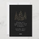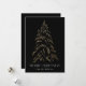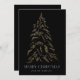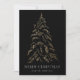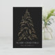 Carta de vacaciones moderna y elegante con un nevado pino de Relieve metalizado dorado con fondo negro (o color de su elección). "Feliz Navidad" se muestra en una fuente serif moderna y blanca con tu nombre o texto personalizado debajo. La tarjeta de vacaciones no fotográfica se revierte para mostrar tres pinos dorados con el mensaje personalizado debajo en texto blanco. Este diseño es perfecto para su uso como tarjeta de Navidad familiar o tarjeta de vacaciones de negocios o corporativas.