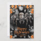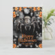 Feliz tarjeta de Halloween con una araña grande en la web adornada con flores naranjas. Personaliza fácilmente esta tarjeta de Halloween con tu nombre y texto familiar.