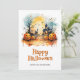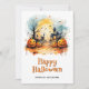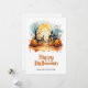 Tarjeta de Halloween con cementerio, jack o’lanterns, murciélagos y un fantasma esqueleto. Personalice fácilmente esta tarjeta acuarela de Halloween con su nombre y texto familiar.