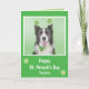 Este lindo perro de Border Collie está usando sus zapatos de cabeza de shamrock y está listo para celebrar el Día de San Patricio! El texto de la parte delantera de la tarjeta se puede personalizar y cambiar el tipo de letra. Las páginas interiores de la tarjeta son de color verde claro. En la parte trasera de la tarjeta hay un solo shamrock verde.