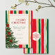 Celebrate the holidays with this elegant striped Christmas card featuring vertical red, green, yellow, and cream lines, and a festive Christmas tree adorned with red bows. A perfect blend of classic color and cheerful holiday design.